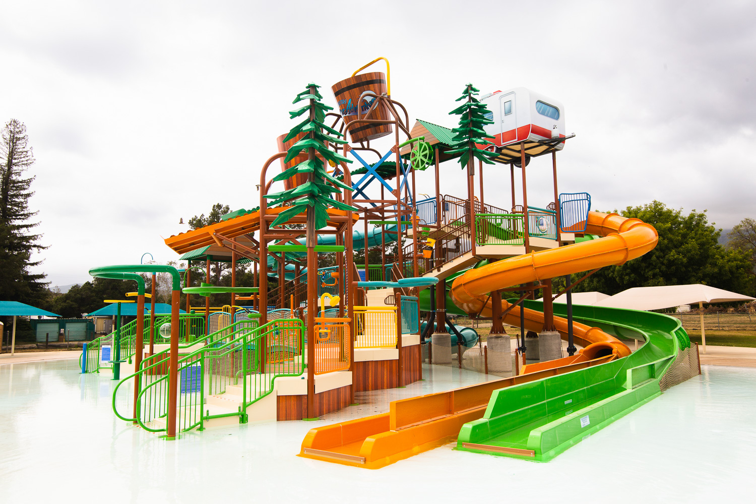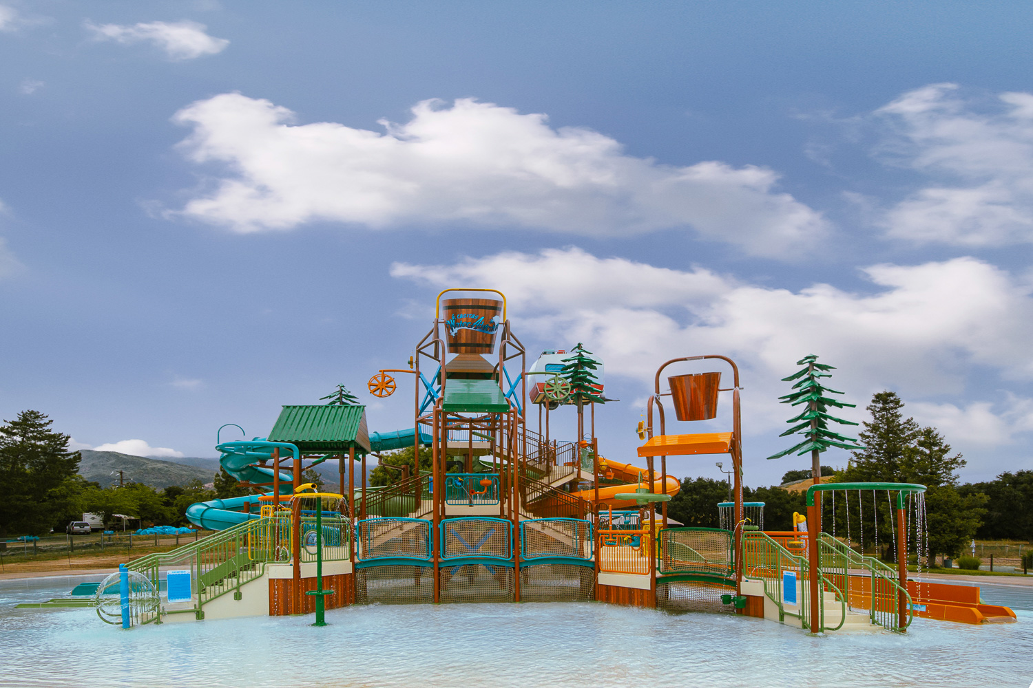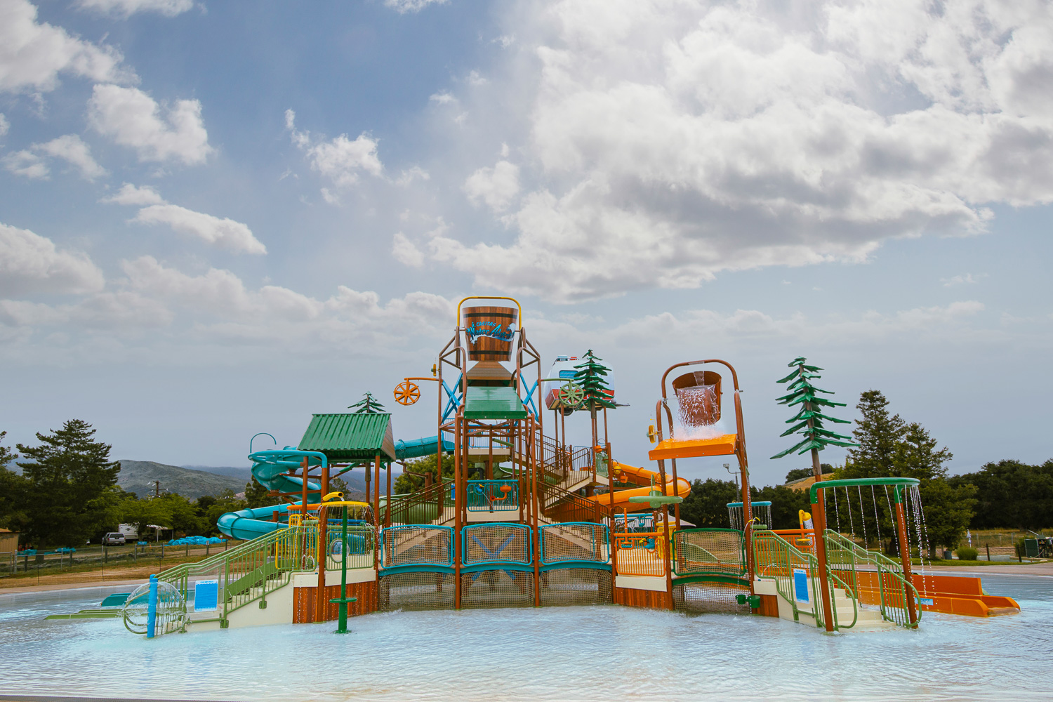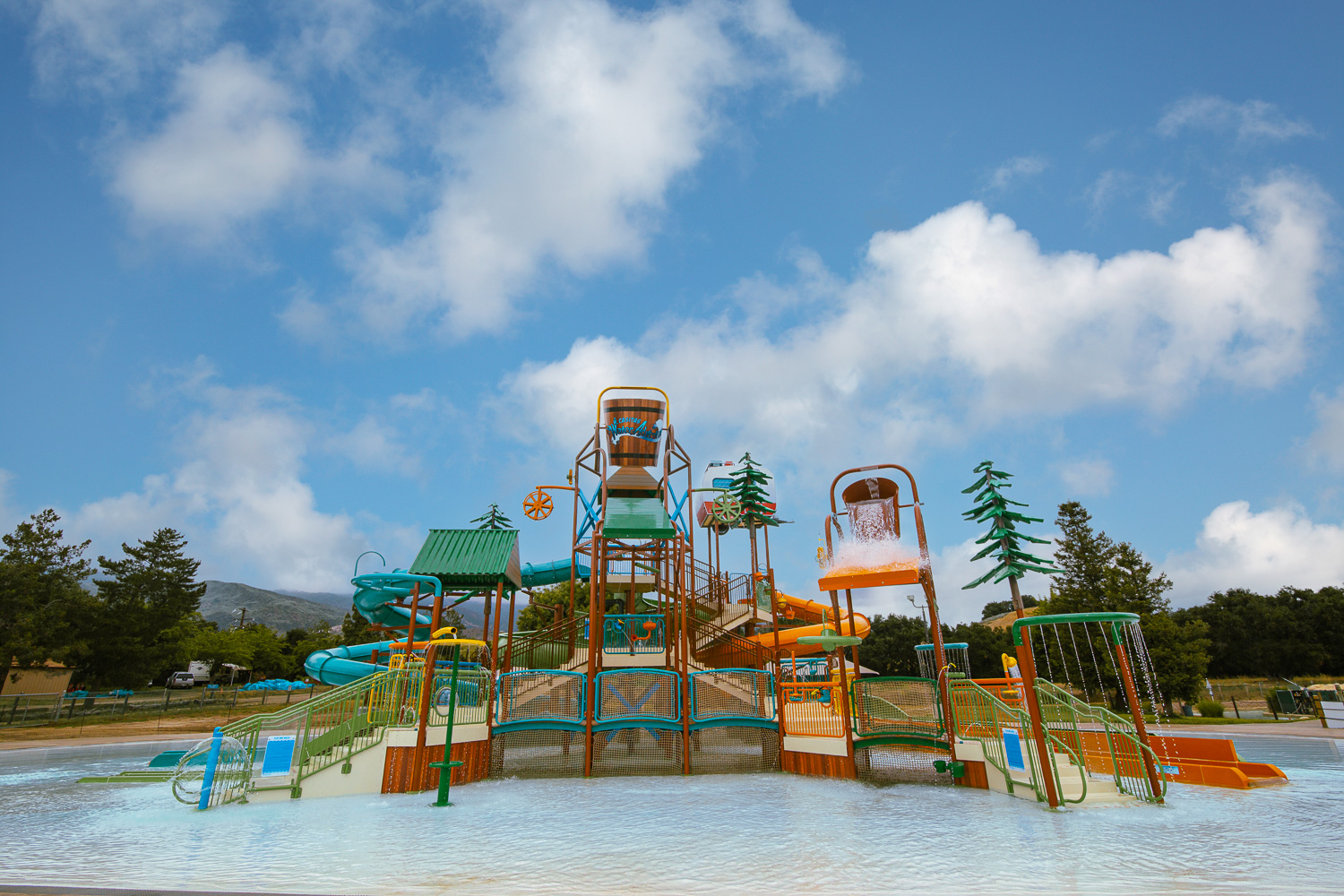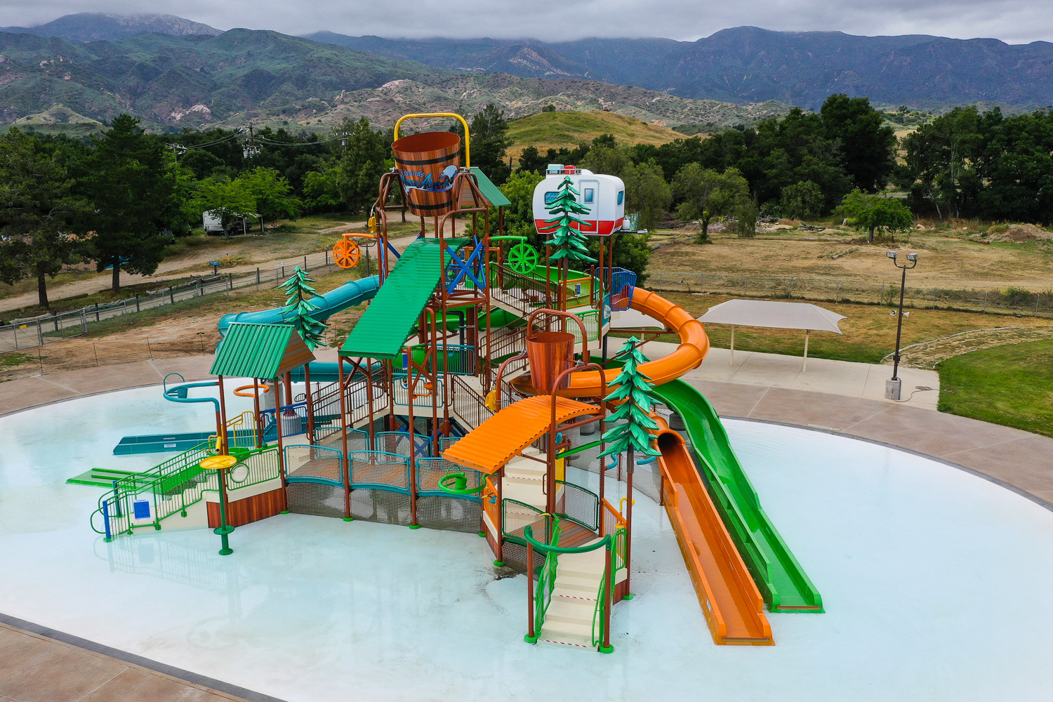At Lake Casitas Recreation Area, the all-new Casitas Water Adventure makes a bold statement as one of Splashtacular’s most heavily themed and feature-rich play structures to date. This mega play unit combines over 40 interactive spray features, four full-sized fiberglass waterslides, and multiple tipping buckets. Themed to capture the nostalgia of a cross-country camping adventure, the design features a to-scale camper van perched above the structure, faux pine trees, and custom woodgrain textures that evoke the warmth and charm of the great outdoors. Every detail, from the faux camper roof to the custom skirting graphics, reinforces the “adventure awaits” theme that resonates with guests of all ages.