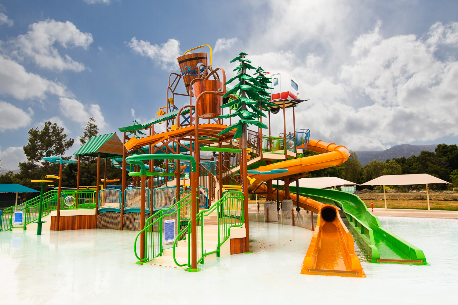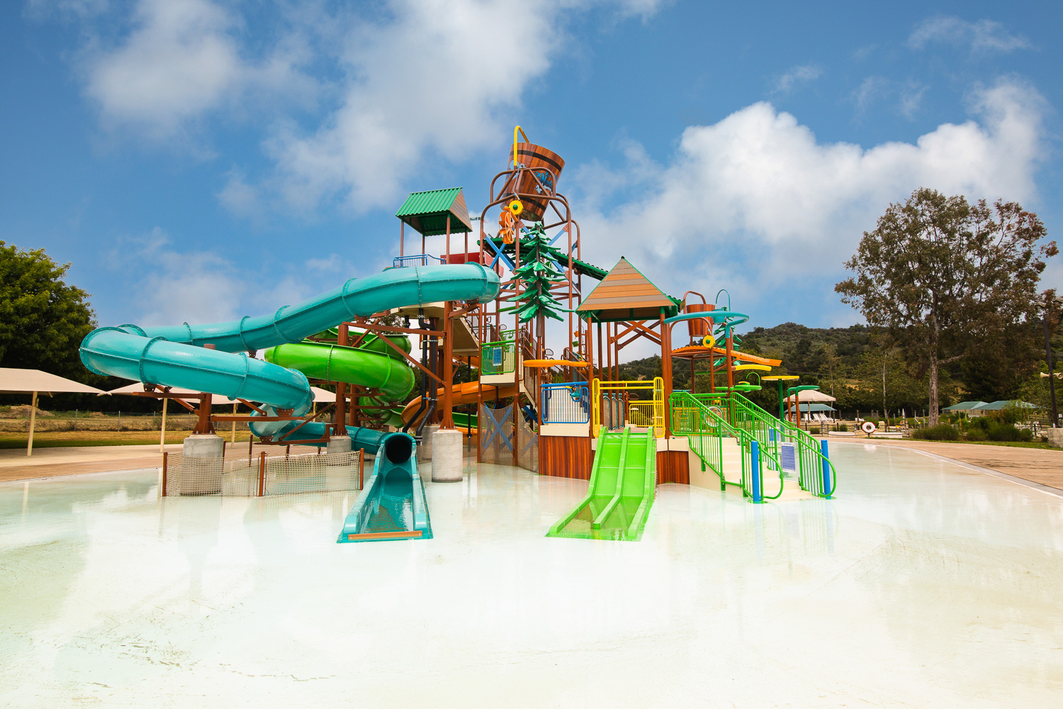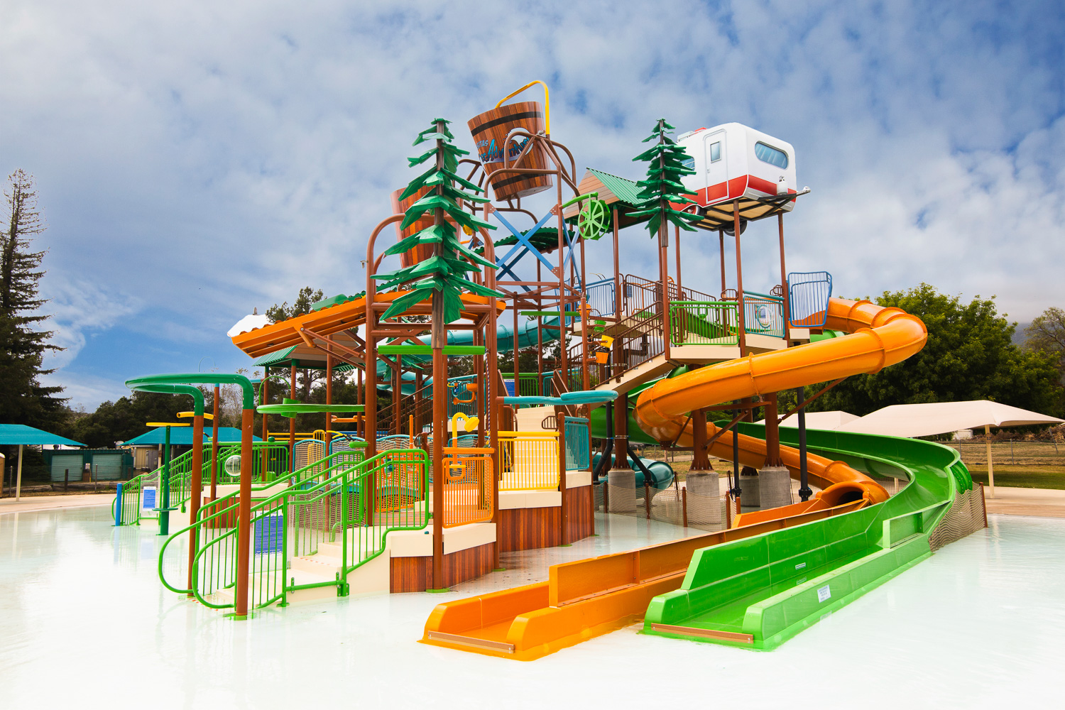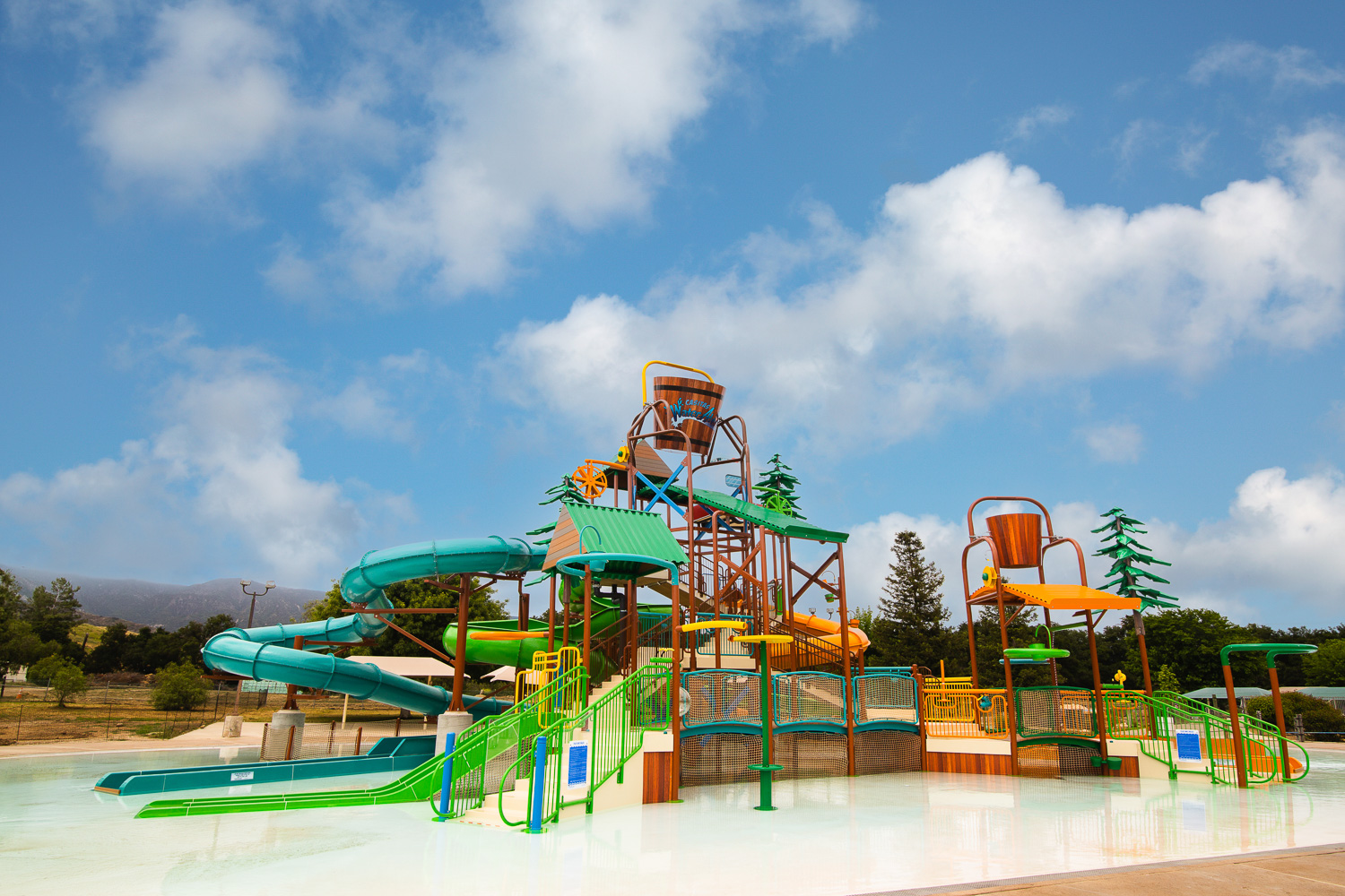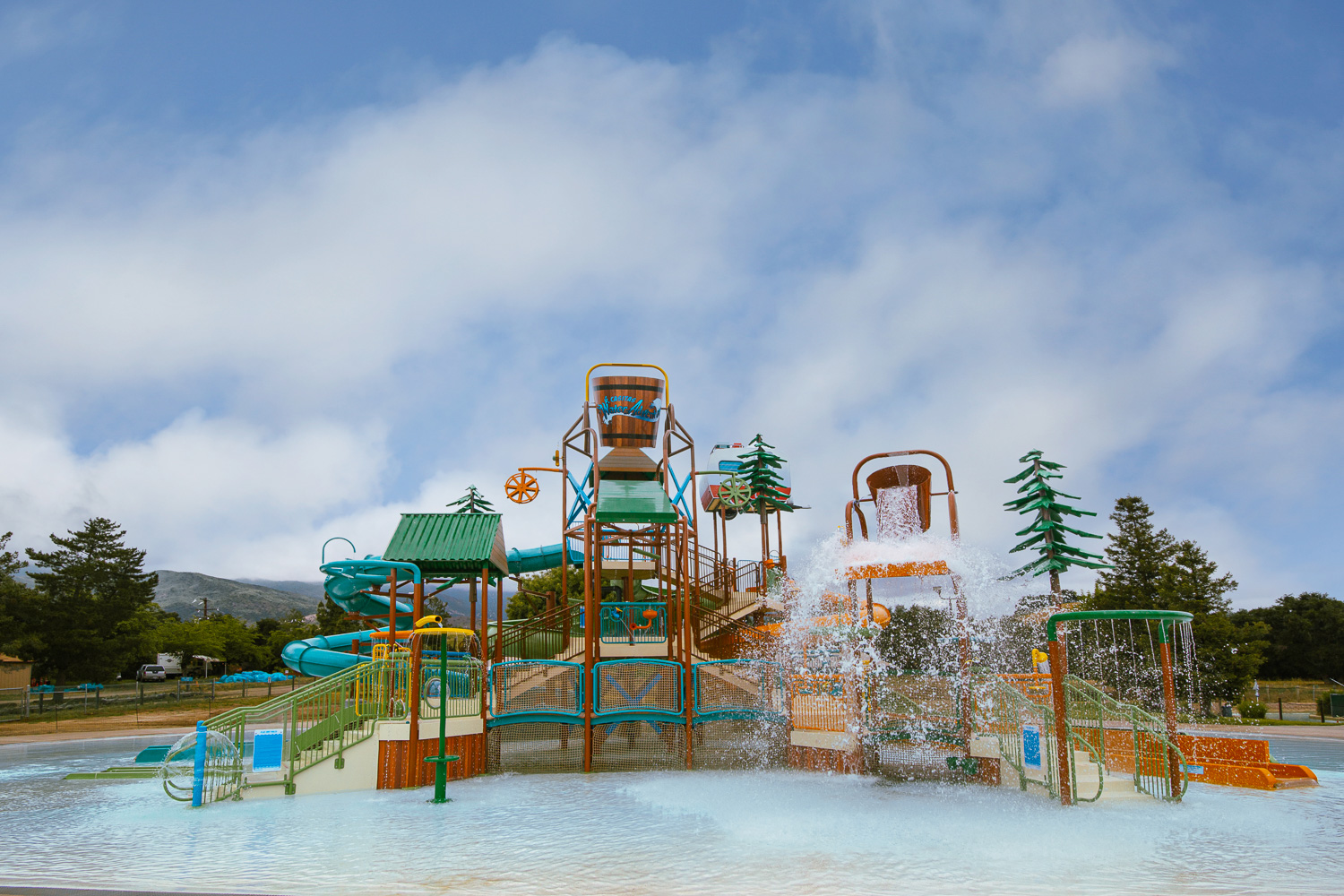 At Lake Casitas Recreation Area, the all-new Casitas Water Adventure makes a bold statement as one of Splashtacular’s most heavily themed and feature-rich play structures to date. This mega play unit combines over 40 interactive spray features, four full-sized fiberglass waterslides, and multiple tipping buckets. Themed to capture the nostalgia of a cross-country camping adventure, the design features a to-scale camper van perched above the structure, faux pine trees, and custom woodgrain textures that evoke the warmth and charm of the great outdoors. Every detail, from the faux camper roof to the custom skirting graphics, reinforces the “adventure awaits” theme that resonates with guests of all ages.