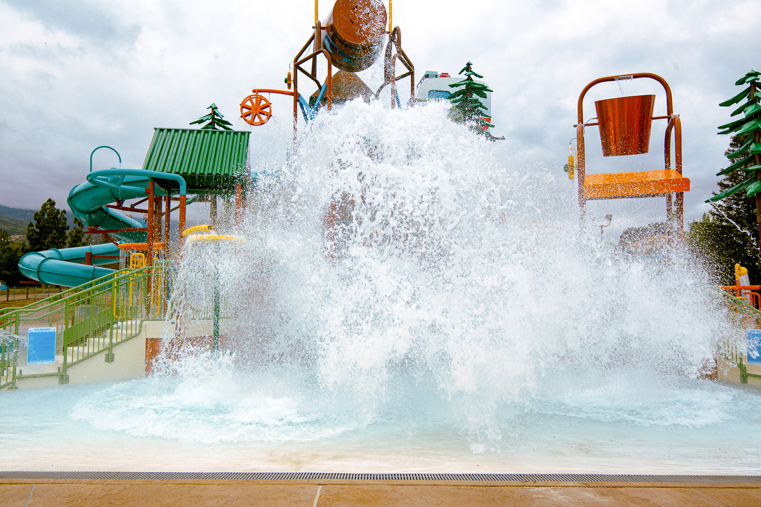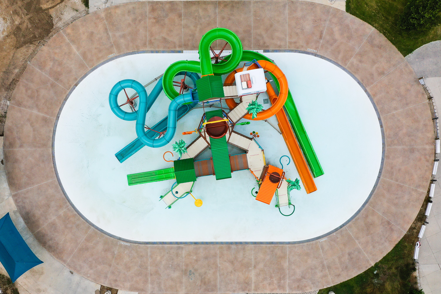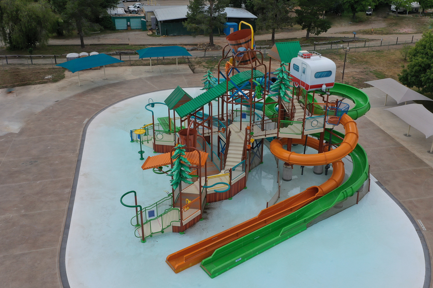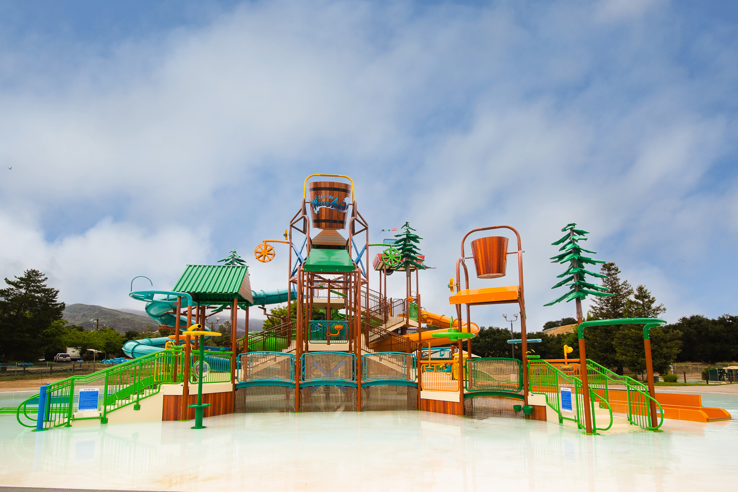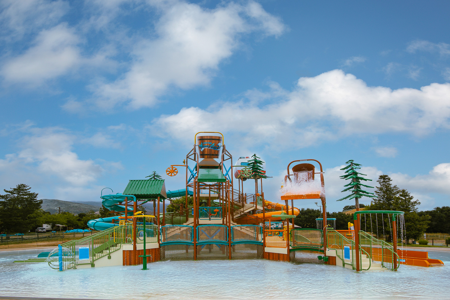 At Lake Casitas Recreation Area, the all-new Casitas Water Adventure makes a bold statement as one of Splashtacular’s most heavily themed and feature-rich play structures to date. This mega play unit combines over 40 interactive spray features, four full-sized fiberglass waterslides, and multiple tipping buckets. Themed to capture the nostalgia of a cross-country camping adventure, the design features a to-scale camper van perched above the structure, faux pine trees, and custom woodgrain textures that evoke the warmth and charm of the great outdoors. Every detail, from the faux camper roof to the custom skirting graphics, reinforces the “adventure awaits” theme that resonates with guests of all ages.