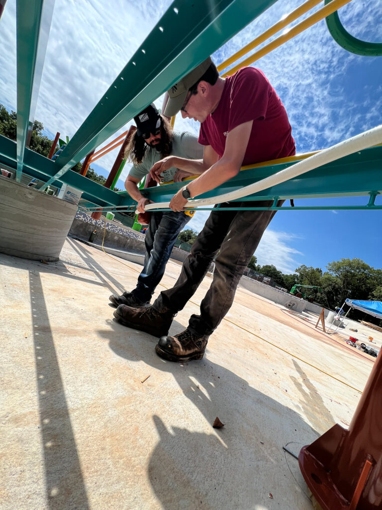 We test all of our slides, aquatic play units, and features after install. We’ll perform a dry inspection (walk around and make sure everything from columns to bolts are correct), then wet inspection (ride the slide multiple times until we have the water pressure correct). After we’ve tested the ride, we train the staff on the proper ways to maintain their new slides, etc. Then they are sent a letter that their slides are certified and can be open to the public.